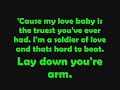 Lay down your arms and surrender to me. Yea lay down your arms and love me peacefully. Yea. Use your arms for squezing and please cuse that's the way it has to be. The weapons you're using are hurting me bad. But someday you're going to retreat. Cause my love baby is the truest you've ever had....